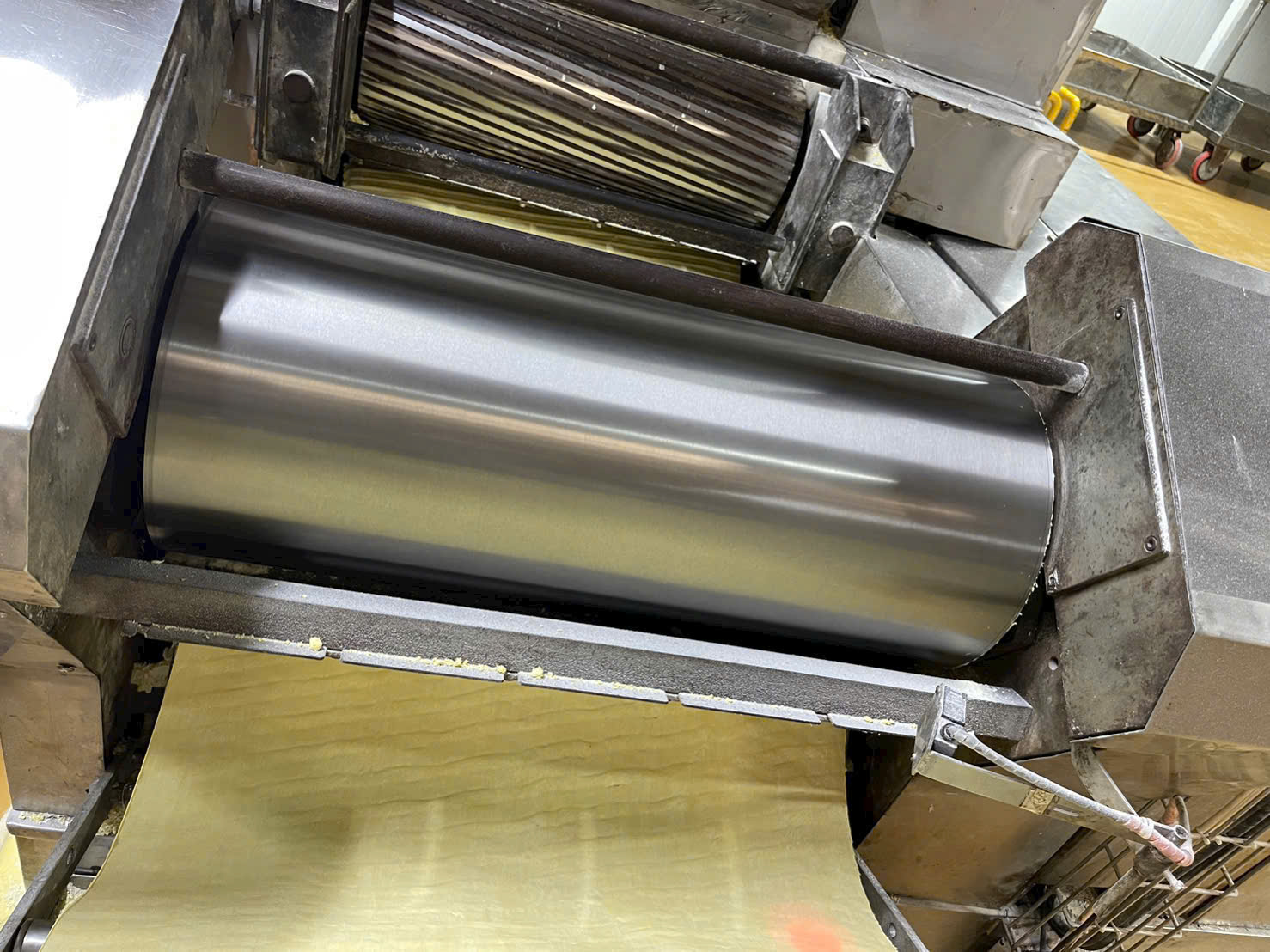 Ở công đoạn này, bột mì sau khi trộn được chuyển đến thiết bị cán tấm bằng hệ thống băng tải. Tại đây, các cặp Lô cán thô và cán tinh sẽ cán mỏng dần lá bột cho đến khi đạt yêu cầu về độ dai, độ dày – mỏng theo quy cách của từng loại sản phẩm.